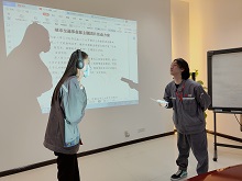 活動中,兩兩分為一組,一人陳述總書記在二十大開幕式上的重要講話和共青團(tuán)建團(tuán)100周年大會上的重要講話中的金句,另外一個人戴著耳機看著對面那個人的口型去描述,現(xiàn)場氣氛歡快熱烈。